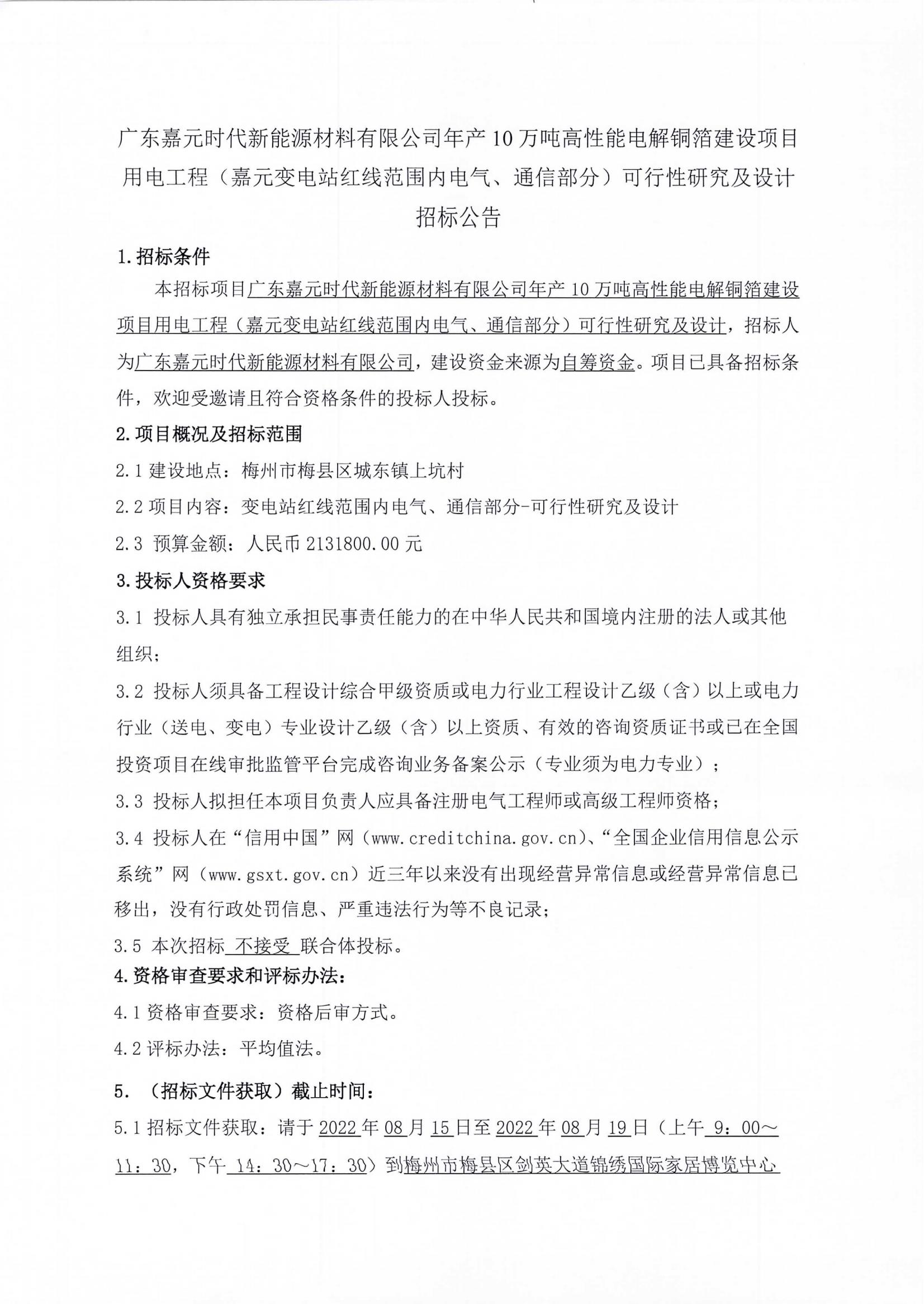 廣東嘉元時代新能源材料有限公司年產(chǎn)10萬噸高性能電解銅箔建設(shè)項目用電工程(嘉元變電站紅線范圍內(nèi)電氣、通信部分)可行性研究及設(shè)計招標公告