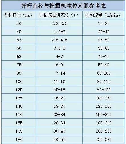 常見(jiàn)的破碎錘釬桿直徑有53、68、75、100、120、135、140、150、165(單位均為毫米)等等,不同品牌之間也細分了很多型號,下面我們就來(lái)看看這些型號的破碎錘應該與多大的挖掘機匹配。